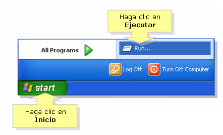 Paso 1.- Haga Click en Inicio, luego en Ejecutar.