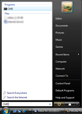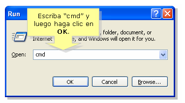 Paso 3.- Cuando aparezca el indicador MS-Dos escriba "IPCONFIG /ALL" y Enter Nota: Para Windows Vista, se requiere abrir CMD como Administrador: Escribir CMD en la cuadro de búsqueda del menú de Vista, pulsar con el botón derecho del ratón en la palabra CMD de la lista de resultados y luego en Ejecutar como administrador. Luego siga las instrucciones para Windows XP a partir del paso 3.